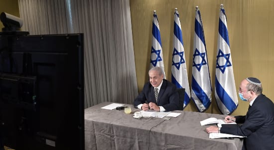 Israeli Prime Minister Benjamin Netanyahu joins a conference call with other world leaders to discuss international travel amid the coronavirus pandemic, May 27, 2020. Photo by Kobi Gideon/GPO.