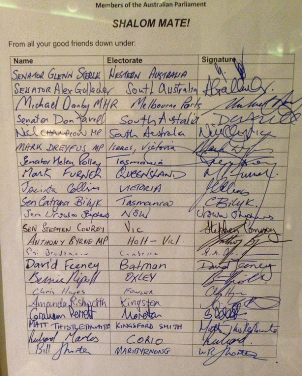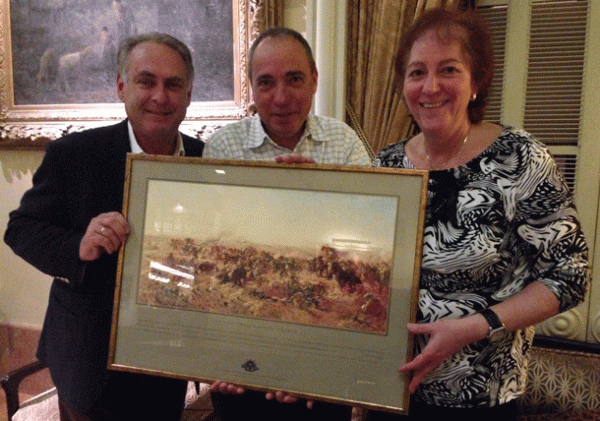 The Farrells visited old friends Yuval and Miri Rotem when in Jerusalem. Rotem returned to Israel in September following a five year tour of duty in Canberra. Senstor Farell presented the Rotems a copy of the iconic artwork “Charge at Beersheva”together with a framed signed greeting from “all your friends Down Under”. The list included current leader of the Opposition Bill SHorton, Shadow Attorney-General and Michael Danby, Labor MP for Melbourne Ports.