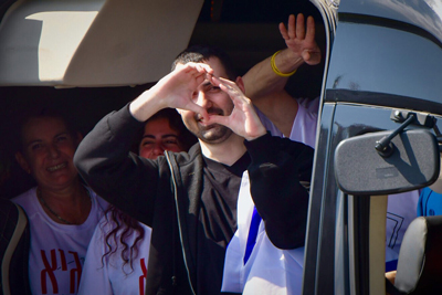 Freed hostage Guy Gilboa-Dalal waves the Israeli flag as he arrives to Beilinson Hospital, Oct. 13, 2025. Photo by Avshalom Sassoni/Flash90.
