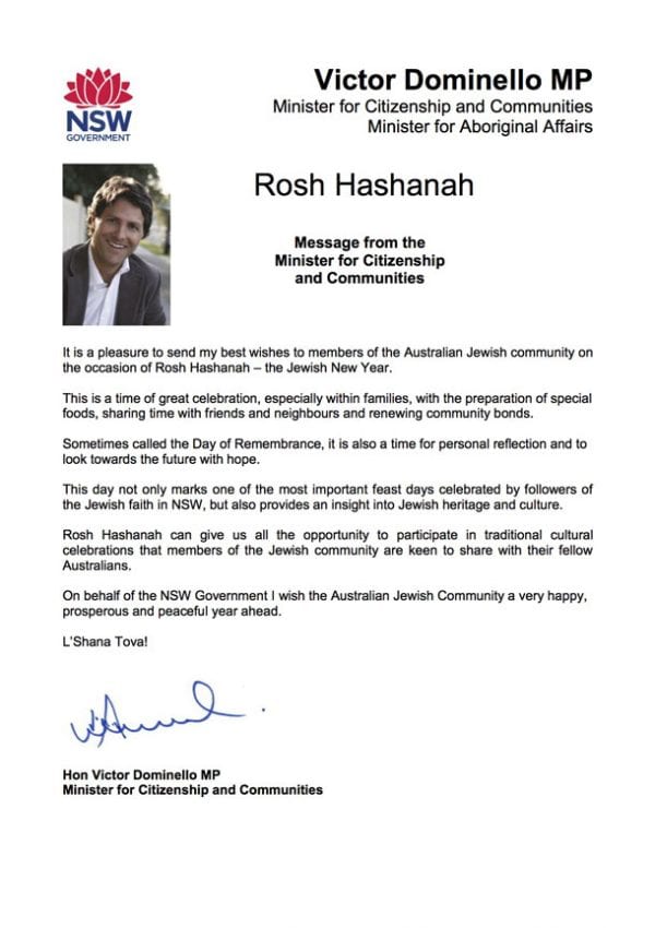 The NSW Minister for Citizenship Victor Dominello sends Rosh Hashana greetings…