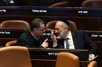Israeli Defence Minister Israel Katz (left) with Shas party leader MK Rabbi Aryeh Deri in the Knesset on December 31, 2024. Photo by Yoav Dudkevitch/TPS-IL