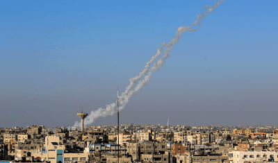 Smoke trails are seen as a rocket is launched from Rafah in the southern Gaza Strip to Israel on May 4, 2019. Credit: Abed Rahim Khatib/Flash90.
