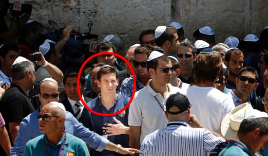 Lionel Messi (centre) seen surrounded by press and security, as he and the FC Barcelona team arrive at the Western Wall in Jerusalem on Aug. 4, 2013. Photo by Miriam Alster/Flash90.