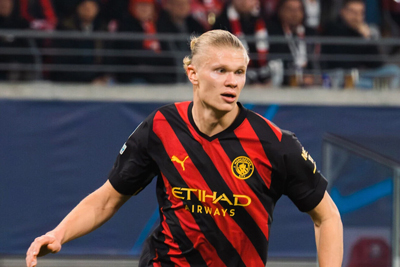 Erling Haaland plays for Manchester City against RB Leipzig in a UEFA Champions League match at the Red Bull Arena, Leipzig, Germany on Feb. 22, 2023. Photo by Jacek Stanislawek/Wikimedia Commons Facebook