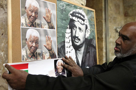 A Palestinian man hangs a picture of former South African leader Nelson Mandela next to a poster of former Palestinian chief Yasser Arafat, at a memorial service for Mandela in Jerusalem’s Old City on Dec. 8, 2013. Photo by Sliman Khader/FLASH90.