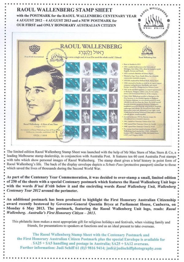 Melbourne’s B’nai B’rith has released a special Raoul Wallenberg Stamp Sheet cancelled by Australia Post with a special postmark.