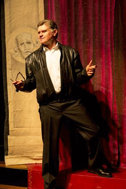 ballet slippers, combined with corporate jacket, shirt and tie with signature glasses, singing merrily while playing the piano. His Kevin Rudd, replete with grey wig and clear rimmed glasses is also superb. Drew Forsythe, as Alan ‘James’ Joyce, delivers a clever and poetic soliloquy in fine voice, creating facial expressions like no other, and Jonathan Biggins, as Clive Palmer, brings his irreverent humour and physicality to all of his characters. As talented actors, with superb accents and impersonation skills, the four switch numerous characters seamlessly from one scene to the next.