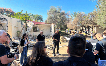 The delegation had an emotional and powerful day in the South of Israel the following day. They met with Amir Cohen, Police Commander of the Southern District and one of the heroes of the October 7 massacre. This was followed by a visit to Kibbutz Reim, a briefing from the head of kibbutz security at one of the horrifying attack sites, and a visit to Kibbutz Nir Oz. There, delegates saw firsthand the total devastation, where 60 people were killed and another 70 taken hostage.