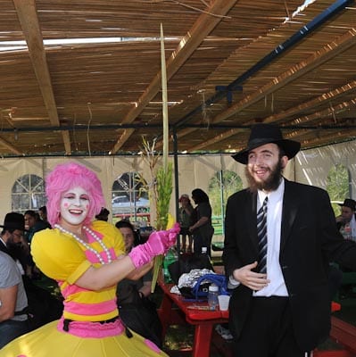 Romy Teperson strolled with her fellow clowns into the area housing the sukkah at the back of the park…and was immediately asked to say the brochat and the then shake the lulav and etrog.