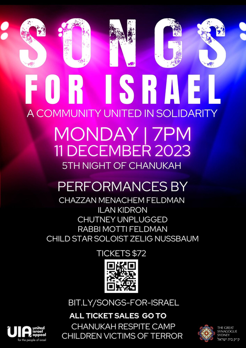 The Sydney Jewish community is invited to an evening of solidarity and song – ‘Songs for Israel’, all in support of our brothers and sisters in Israel, on Monday 11 December.