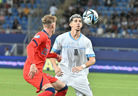 Dor Turgeman (left) of Israel’s Under-21 soccer team at the UEFA European Under-21 Championship semifinals in Batumi, Georgia, on July 5, 2023. Israel lost 3-0 to England. Photo by TPS