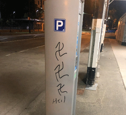 Three swastikas and the word “heil” were scrawled onto a parking meter on Wentworth Park Road in Sydney’s Glebe but despite being reported to the council, the offensive graffiti remained for several days.
