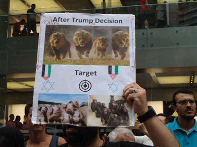 The event on Sunday was to protest the recognition by the US President of Jerusalem as the capital of Israel. Trump’s declaration was merely a recognition of the fact that Jerusalem has been the seat of government in Israel since 1948; it did not pre-empt any outcome in Israeli-Palestinian negotiations. The protest in Sydney was one of several across Australia.