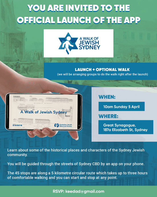 *It is advised to download the tour prior to attending the launch on the 5th April. Just search for A walk of Jewish Sydney in the App Store (iPhones) or in Google Play (Androids)