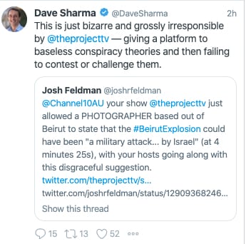 Meanwhile, Wentworth Federal Liberal MP Dave Sharma responded in Twitter to a tweet criticising Channel 10’s The Project allowing a photographer insinuating the massive explosion could have been a military attack from Israel.
