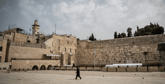 A religious Jew walks near the Western Wall in the Old City of Jerusalem on March 27, 2020. The government ordered a partial lockdown to prevent the spread of the coronavirus (COVID-19). Photo by Yonatan Sindel/Flash90.