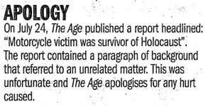Following complaints to the Press Council by the Jewish Community Council of Victoria, The Age has printed an apology.John Searle, President of the JCCV reports: