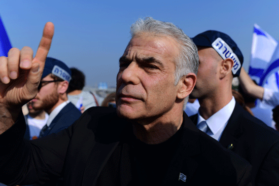 Outgoing interim Israeli Prime Minister Yair Lapid and his Yesh Atid Party activists protest in Tel Aviv against Likud Party leader and incoming premier Benjamin Netanyahu’s elected government, in Tel Aviv, Dec. 9, 2022. Photo by Tomer Neuberg/Flash90.