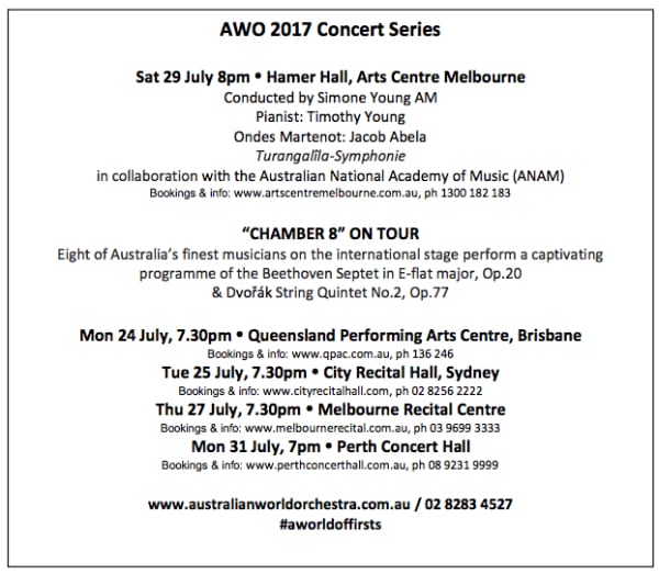The Australian World Orchestra (AWO) has announced two major performance events for their 2017 season, with internationally renowned conductor Simone Young returning to lead musicians from the AWO and the Australian National Academy of Music (ANAM) in a spectacular one-off performance of Olivier Messiaen’s orchestral masterpiece Turangalîla-Symphonie at Melbourne’s Hamer Hall.