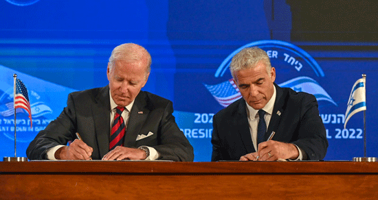 President Joe Biden (L) and PM Yair Lapid sign the Jerusalem Declaration. (Koby Gideon/GPO)