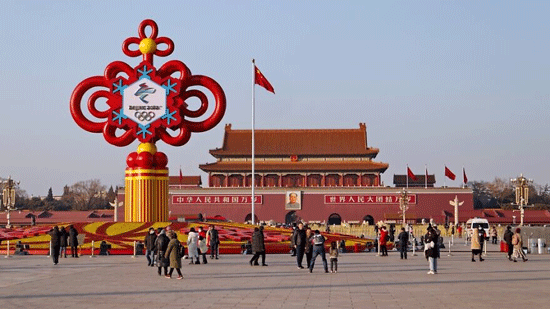 Beijing 2022 Winter Olympics emblem at Tiananmen Square in China’s capital on Jan. 29,2022. Credit: Calvin86/Shutterstock.