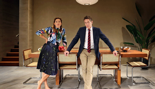 The interactions occur in the lounge and dining room of the Grays’ modern, spacious home (the set designer is Jeremy Allen).