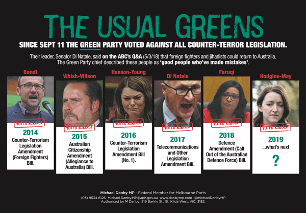 Until I published the attached hard-hitting ads, few knew that the Green Party had voted against every proposal in the Australian Parliament to protect the security of our nation against terrorist threats. My research for this claim is based on a vote-by-vote analysis by the Federal Parliamentary Library – a neutral and prestigious organisation – who, at my request, examined every vote of the Green Party on National Security and Counter-Terrorism legislation since the commencement of the post-cold war terrorist era (which began with the murder of more than 3000 people at the World Trade Centre in New York on September 11th, including 10 Australians who were amongst the victims).