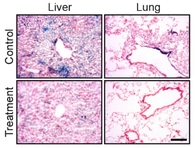 Drug treatment eliminates senescent cells from tissues of old mice. The blue staining shows senescent cells in lung and liver tissue. The amount of the staining is significantly reduced following the drug treatment credit: Weizmann Institute of Science