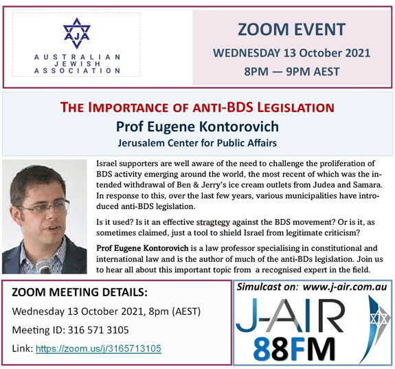 Oct-13 8pm AEST Zoom: The importance of anti-BDS legislation