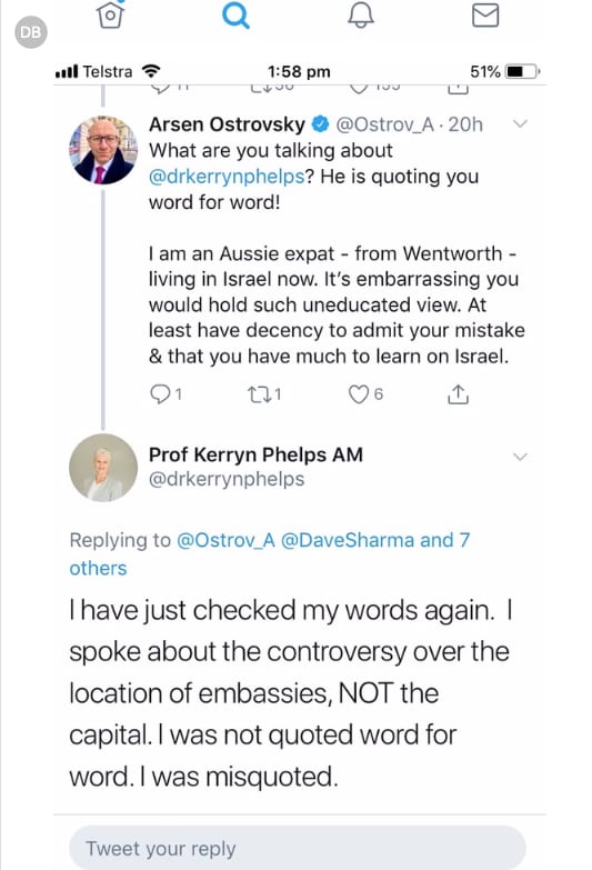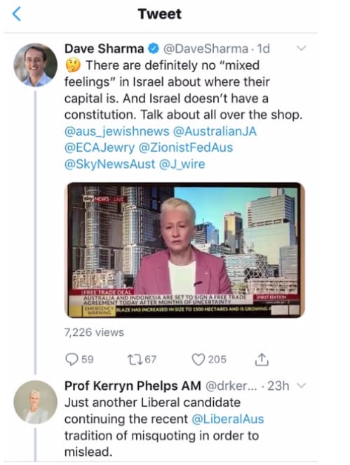 A supporter of the Federal Liberal candidate for the Eastern Suburbs seat of Wentworth Dave Sharma was blocked on Twitter for taking the incumbent Independent member Dr Kerryn Phelps to task for her remarks about Israelis’ feelings on Jerusalem being the country’s capital.