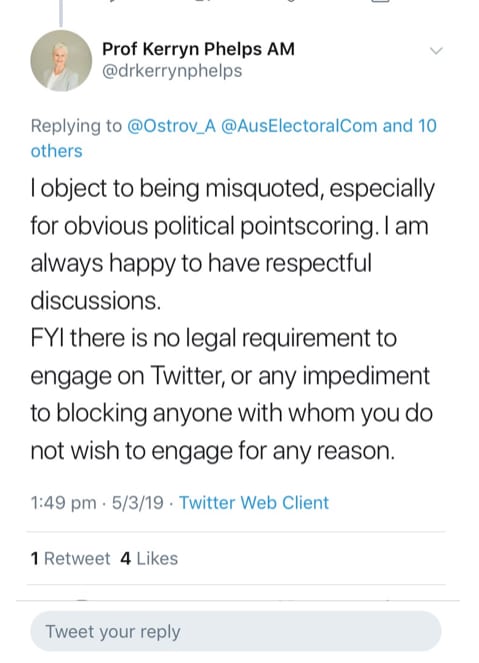 Dr Phelps told J-Wire: “On Twitter I get orchestrated attacks on a range of issues, often at the urging of a political opponent. I have a line in the sand as a protective mechanism. This person crossed that line of