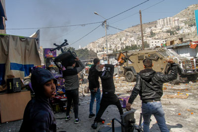 Palestinians attack Israeli security personnel during a counter-terrorism operation in Nablus, Feb. 22, 2023. Photo by Nasser Ishtayeh/Flash90.