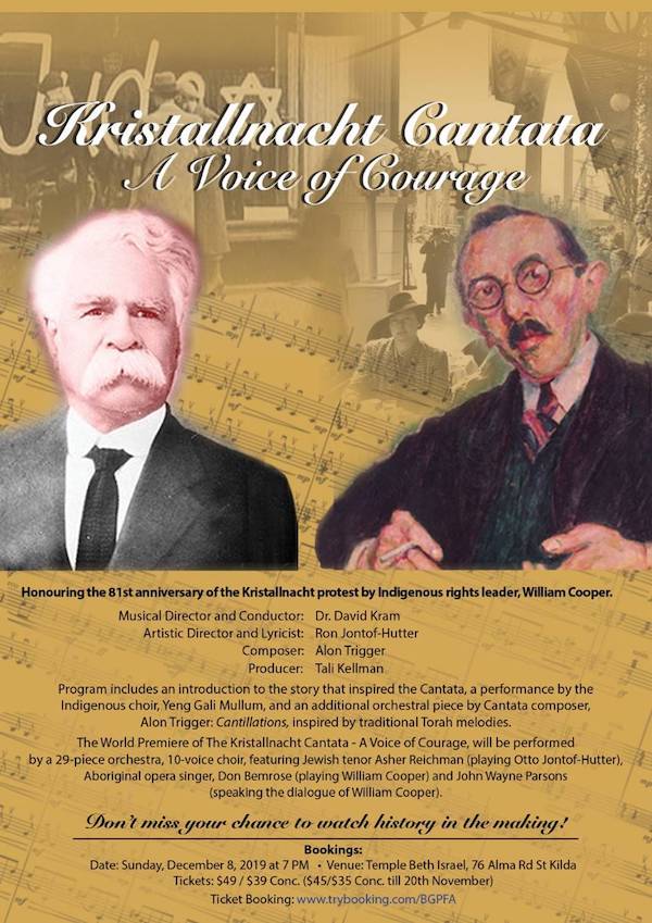 In far off Australia, Aboriginal Leader William Cooper, deprived of rights himself, stands up and marches with a delegation of elders to the German Consulate in Melbourne to hand in a letter protesting “the cruel persecution of Jews.” The cantata, based on real people and real events pays tribute to this unique man.