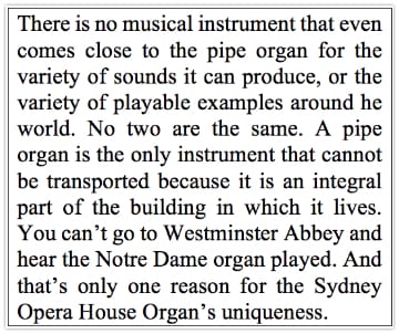 It was not obvious how many Sydney music lovers share my enthusiasm for a stirring organ recital until I found that there were enough to almost fill the Opera House at 11:00am last Friday. Having said that, because this mostly-seniors audience is unlikely to comprise many organ music devotees, programs that work best are made up of shorter pieces that collectively exploit the capabilities of the instrument.