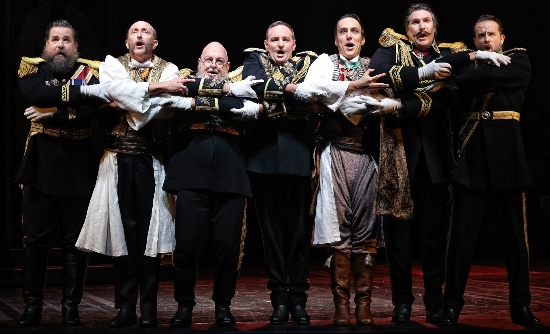 Richard Anderson as Alexis Kromov, David Whitney as Baron Mirko Zeta, Tom Hamilton as Konrad Pritschich, Brad Cooper as Raoul de St. Brioche, Alexander Lewis as Danilo Danilovich, Luke Gabbedy as Viscount Nicolas Cascada, Alexander Hargreaves as Dominik Bogdanovich in Opera Australia’s production of The Merry Widow at the Sydney Opera House. Photo Credit: Prudence Upton
