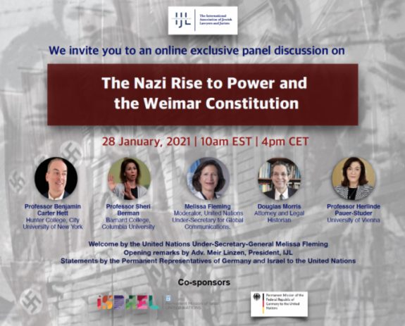This year, the International Association of Jewish Lawyers and Jurists (IJL) will, in partnership with The Holocaust and the United Nations Outreach Programme mark the International Day of Commemoration in memory of the victims of the Holocaust by sponsoring an online event entitled “The Nazi Rise to Power and the Weimar Constitution.”
