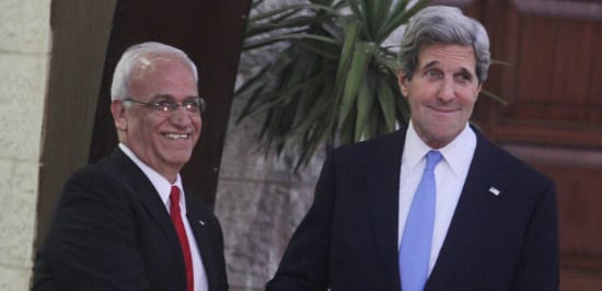 Former U.S. Secretary of State John Kerry with chief Palestinian negotiator Saeb Erekat, prior to Kerry meeting with Palestinian Authority leader Mahmoud Abbas in Ramallah, April 7, 2013. Photo by Issam Rimawi/Flash90.