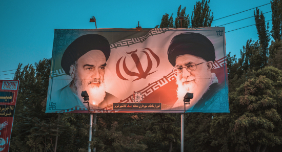 A billboard displaying Iranian Ayatollahs Ruhollah Khomeini and Ali Khamenei. Credit: Erdalislakphotography/Shutterstock.