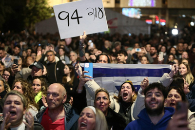 Hundreds of Israelis gather in Tel Aviv’s Hostage Square on Jan 19. 2025 ahead of the release of Israeli captives Romi Gonen, Emily Damari, and Doron Steinbrecher. The sign being held says “94 left.” Photo by Gideon Markowicz/TPS-IL