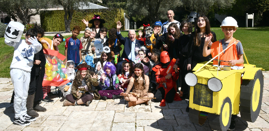 The students brought mishloach manot gifts to President Reuven (Ruvi) Rivlin for the Purim holiday. Following the Ministry of Health’s instructions not to shake hands, the children offered to bump feet with the president. “A wonderful idea,” said the president, and made sure to bump feet with every child, who were already excited in their costumes.
