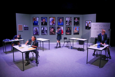 The simple set design by Ben Andrews, highlighted by portraits of 13 powerful women in a classroom environment, sets the tone.