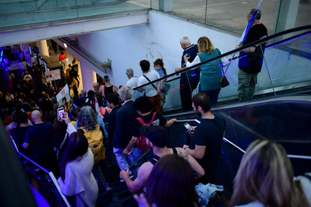 Families of Israelis held hostage in Gaza and supporters take cover as siren warns of incoming missile fired from Yemen, during a protest march for the release of hostages held in Gaza, at Habima Square in Tel Aviv, May 13, 2025. Photo by Tomer Neuberg/Flash90.