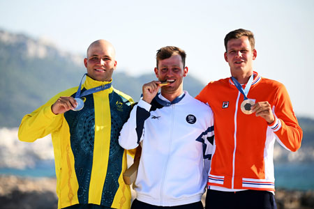 Silver medalist Grae Morris of Team Australia, Gold medalist Tom Reuveny of Team Israel and Bronze medalist Luuc Opzeeland of Team Netherlands celebrate at the medal ceremony for the Men’s Windsurf iQFoil class final at the medal ceremony on day eight of the Olympic Games Paris 2024 at Marseille Marina on Aug. 3, 2024 in Marseille, France. Photo by Clive Mason/Getty Images.