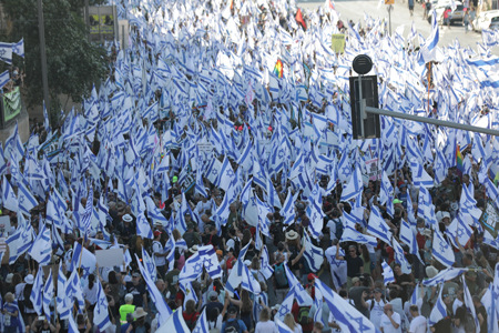Thousands of anti-government protesters hold Israeli flags during a protest march entering to Jerusalem to rally against the Israeli government’s judicial reform plans, in Jerusalem, 22 July 2023.