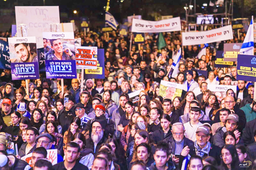 Thousands of Israelis take part in a rally in front of the Prime Minister’s Office in Jerusalem on Feb. 8, 2024. Photo by Eyal Buchris/TPS.