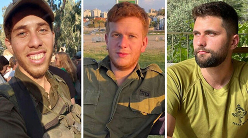 From left, Sgt. Uri Bar Or, Staff Sgt. Ido Appel, and Staff Sgt. Amir Galilove, killed in booby-trapped building in Rafah on May 28, 2024. Photos by the IDF Spokesperson
