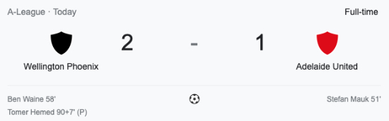 Israeli soccer star Tomer Hemed stunned third-top A-League Adelaide by scoring a last-second penalty to secure a 2-1 victory for New Zealand Wellington Phoenix in Wollongong today.