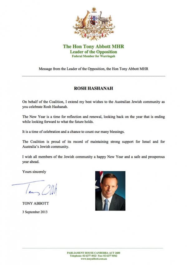 The Leader of the Opposition Tony Abbott has taken time out from his election campaign to send Rosh Hashanah greetings to the Australian Jewish community.