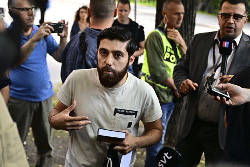 Ahmed Alloush talks to the media outside the Israeli embassy in Stockholm, Sweden, July 15, 2023. The man who said he would burn the Torah and the Bible outside the Israeli Embassy in Stockholm gave up his plan and instead held a one-person demonstration against burning holy books. (Magnus Lejhall/TT News Agency via AP