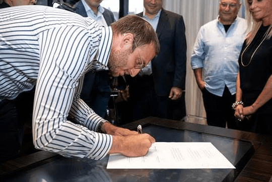 Mosaic United CEO Rabbi Benji Levy signs a partnership agreement with the leadership of UJA Federation of Greater Toronto to officialize the Toronto Jewish community’s investment in the Shalom Corps Jewish service initiative. Credit: Mosaic United.